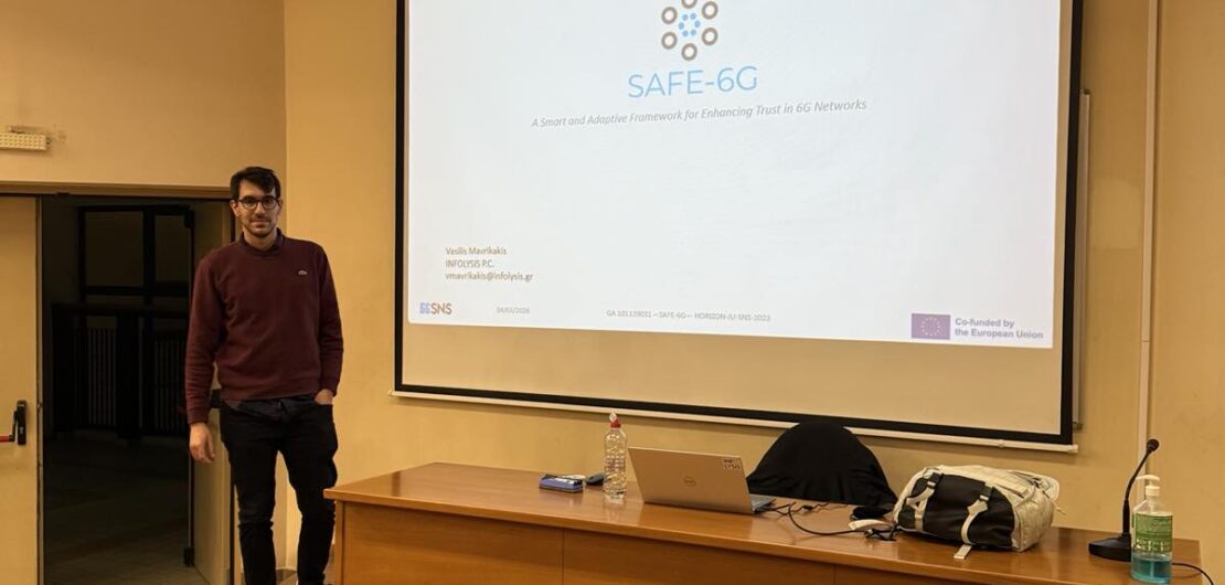 Vasilis Mavrikakis from INFOLYSiS presented the SAFE-6G project to undergraduate students at the National and Kapodistrian University of Athens during a lecture on market research. The presentation introduced the project’s objectives and explained how market research is used to understand stakeholder needs, identify potential applications, and support the development of new technologies. Students gained insight into how research projects combine technological innovation with market analysis to guide future digital communication services.